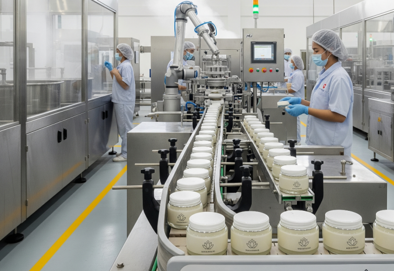 สวัสดีค่ะ วันนี้พี่แจงพาเข้ามาดูไลน์บรรจุครีมกันนะคะ ตามเข้ามาเลยค่ะ ก่อนที่จะบรรจุครีมนะคะเราก็จะมีการทำความสะอาดกระปุกนะคะ ทุกๆกระปุกนะคะก่อนที่จะนำเข้าเครื่องค่ะ เครื่องบรรจุนี้จะเป็นเครื่องกึ่งอัตโนมัติ มีการควบคุมและก็ตั้งน้ำหนักนะคะ ไว้อย่างอัตโนมัติได้เลย ให้ทุกๆกระปุกมีน้ำหนักผลิตภัณฑ์ที่เท่ากันค่ะ หลังจากบรรจุเสร็จแล้วนะคะก็จะนำมาปิดฝานะคะ ปิดฝาให้เรียบร้อย แล้วเราก็จะมีการตรวจเช็คในทุกๆบรรจุภัณฑ์ก่อนที่จะลำเลียงออกไปสู่ด้านนอกค่ะ เดี๋ยวเราไปดูงานท้ายไลน์กันค่ะ หลังจากปิดฝาแล้วนะคะ ขั้นตอนถัดไปก็คือจะเป็นการที่เรานำเซมิโปรดักนะคะเตรียมลงกล่องค่ะ แล้วก็จะไปซีลพลาสติก ซึ่งในคลิปถัดไปนะคะพี่แจงก็จะพาพวกเราค่ะไปดูขั้นตอนการลงกล่องและก็ซีลพลาสติกในขั้นตอนต่อไป วันนี้ก็จะเป็นเรื่องของการบรรจุนะคะ สำหรับลูกค้าที่สนใจนะคะที่จะสั่งผลิตกับเรานะคะ เริ่มต้นที่500ชิ้น ภาพการบรรจุก็จะเป็นลักษณะคล้ายๆแบบนี้เลยค่ะ แล้วแต่ผลิตภัณฑ์สวยงามแบบนี้เลยค่ะ